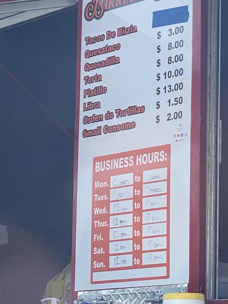 Introducing the menu at Birrieria y Taqueria Cortez, located in Fort Worth, TX, where you can indulge in authentic Mexican flavors. From Tacos de Birria to Quesabirria Tacos, each dish is bursting with savory meat, cheese, and seasonings. Customers rave about the rich consomme served on the side, adding depth to the already flavorful tacos. The welcoming atmosphere, complete with vibrant murals, adds to the overall dining experience. Don't miss out on their specials like Flautas and refreshing Horchata. Birrieria y Taqueria Cortez is a must-visit for those craving traditional Mexican comfort food that exceeds expectations. With a variety of options and friendly service, this food truck offers a true taste of Mexico, leaving customers coming back for more.